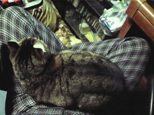 ウチのネコはダッコされるのが嫌いなんです。そのくせ人の上に乗るんです。今まではコタツに入っているときにコタツ布団の上から膝の上に乗って寝るだけでいたけど、最近は、こうして椅子に座ってパソコンをいじっているときでも乗るようになってきた。